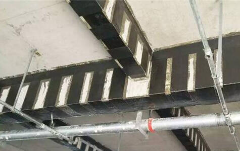 Strengthening beams: enlarging reinforced concrete beam section, strengthening with carbon fiber fabricand sticking steel reinforcement. Column reinforcement: bonded steel reinforcement, carbon fiber cloth reinforcement.